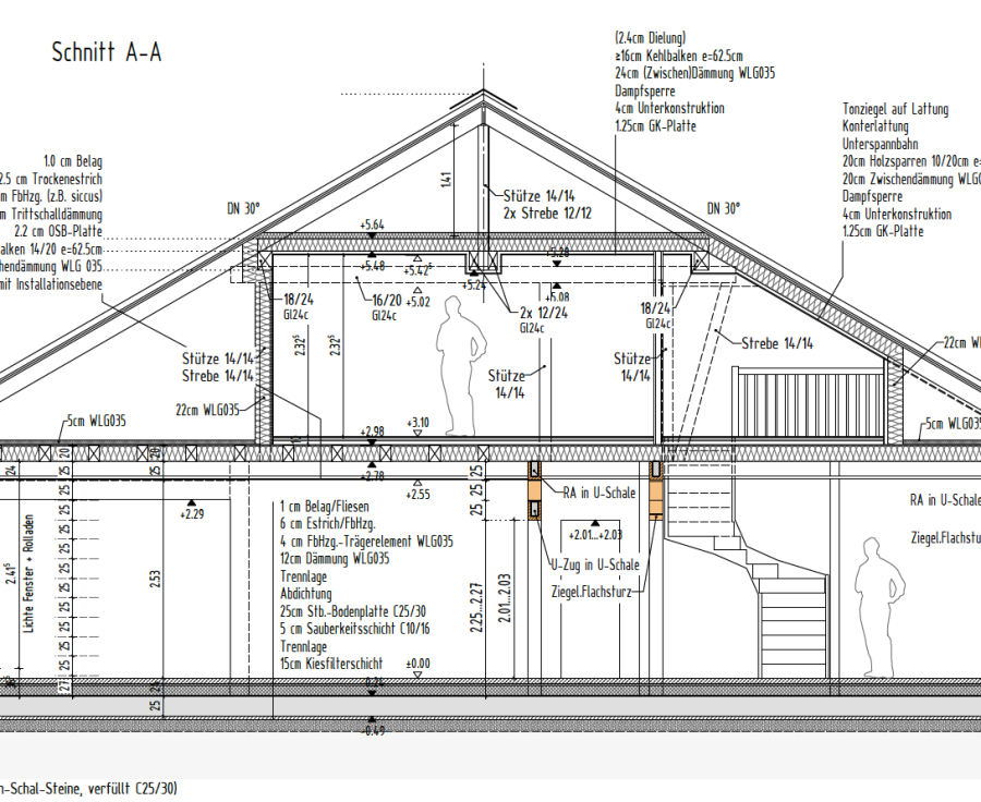 In Abstimmung mit dem Bauherren und den Fachhandwerkern wurde eine Aufsparrendämmung verwendet. Dieses System ist in der Lage zum einen die Solaranlage und zum Anderen Sicherheitseinrichtungen für Schornsteinfegerarbeiten zutragen. Darüber hinaus konnten die gewünschten Sichtbalken realisiert werden.